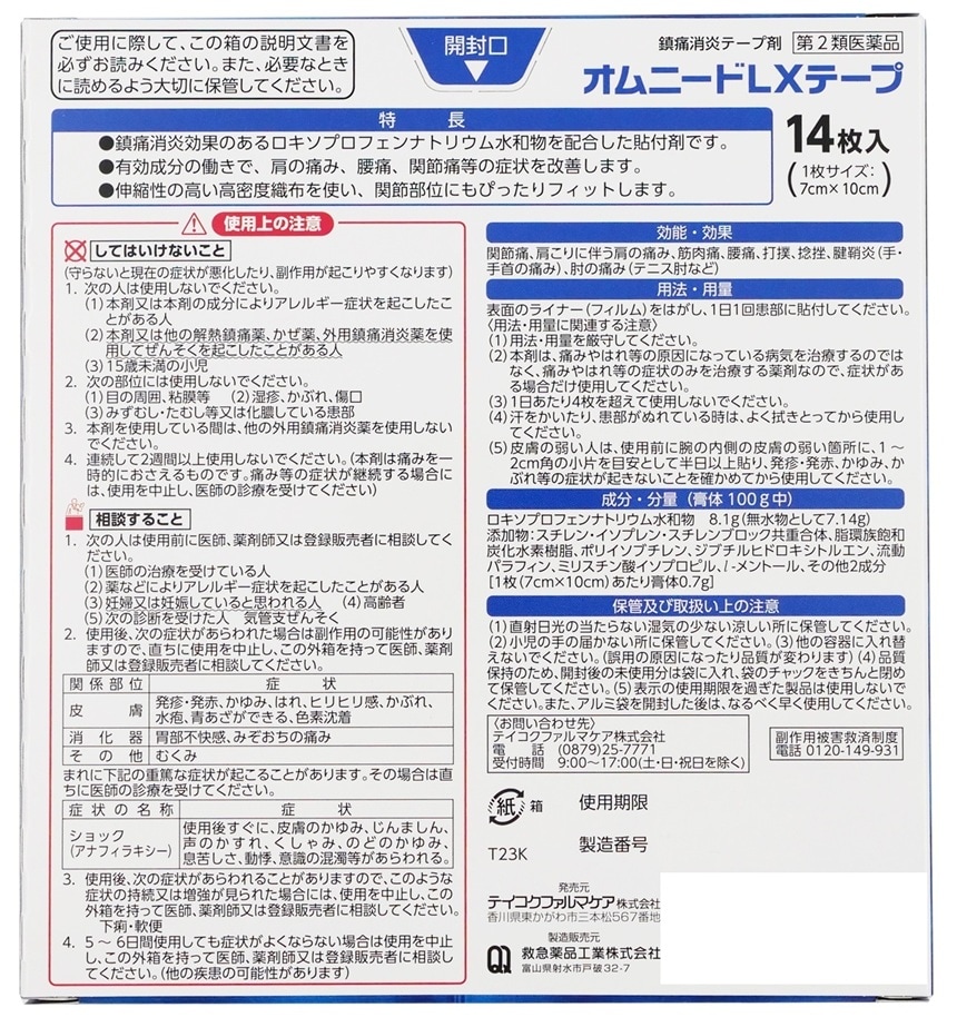 [計140枚]【第2類医薬品】テイコクファルマケア オムニードLXテープ 14枚入×10個 | ロキソプロフェンNa8.1%配合したテープ剤です。ツラい痛みに効きます!