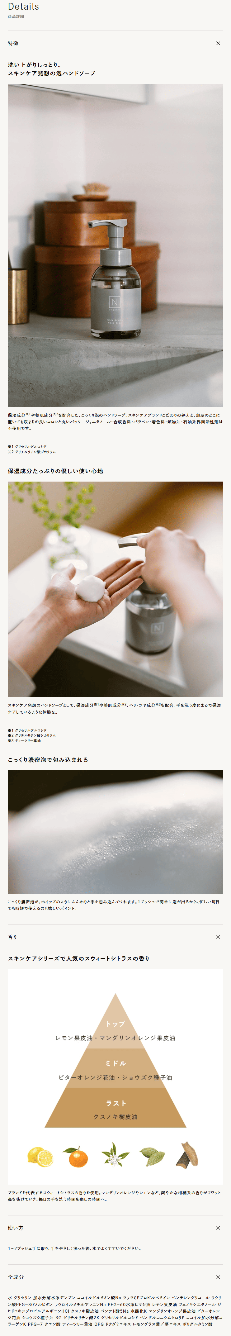 ブランドを代表するスウィートシトラスの香りを使用。マンダリンオレンジやレモンなど、爽やかな柑橘系の香りがフワッと鼻を抜けていき、毎日の手を洗う時間を癒しの時間へ。