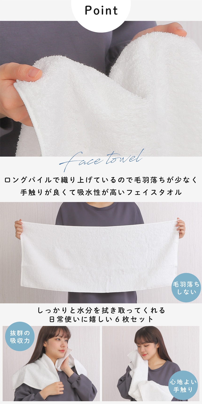 - <シンプル百科>【6枚セット ホワイト】吸水性が良くて毛羽落ちが少ない フェイスタオル
