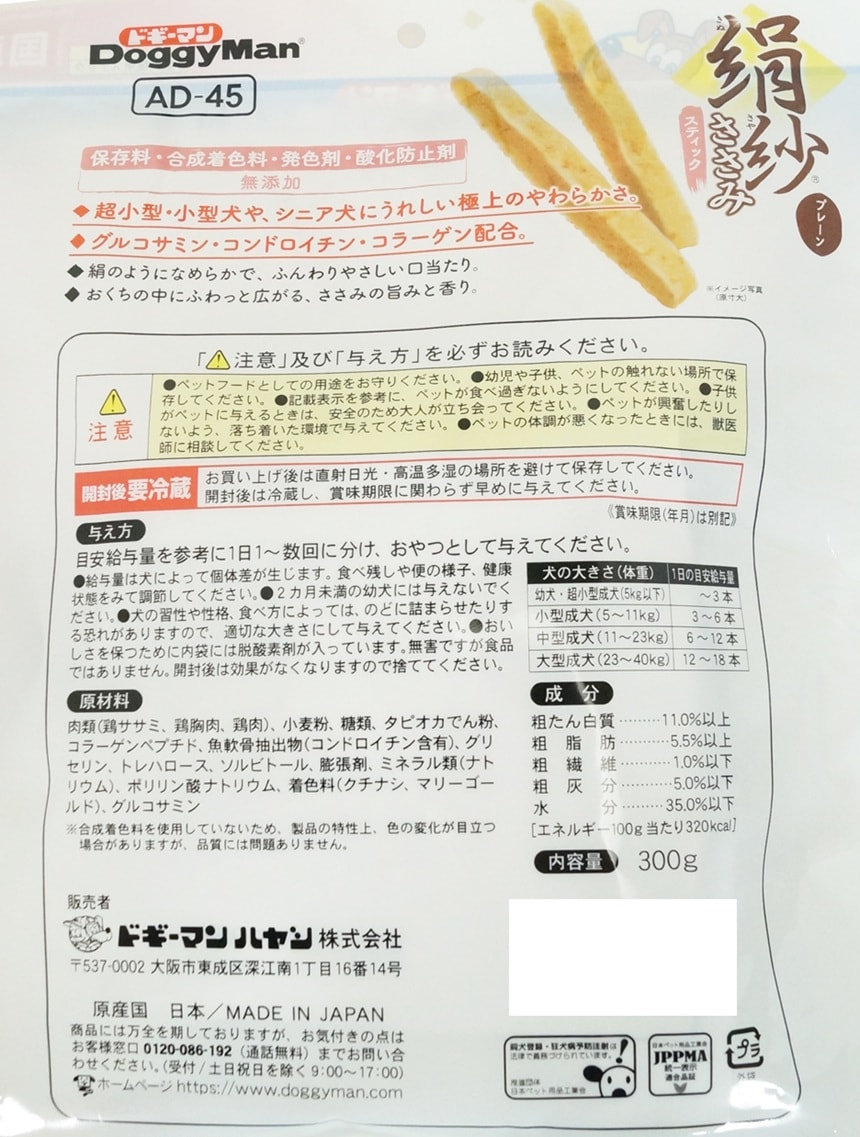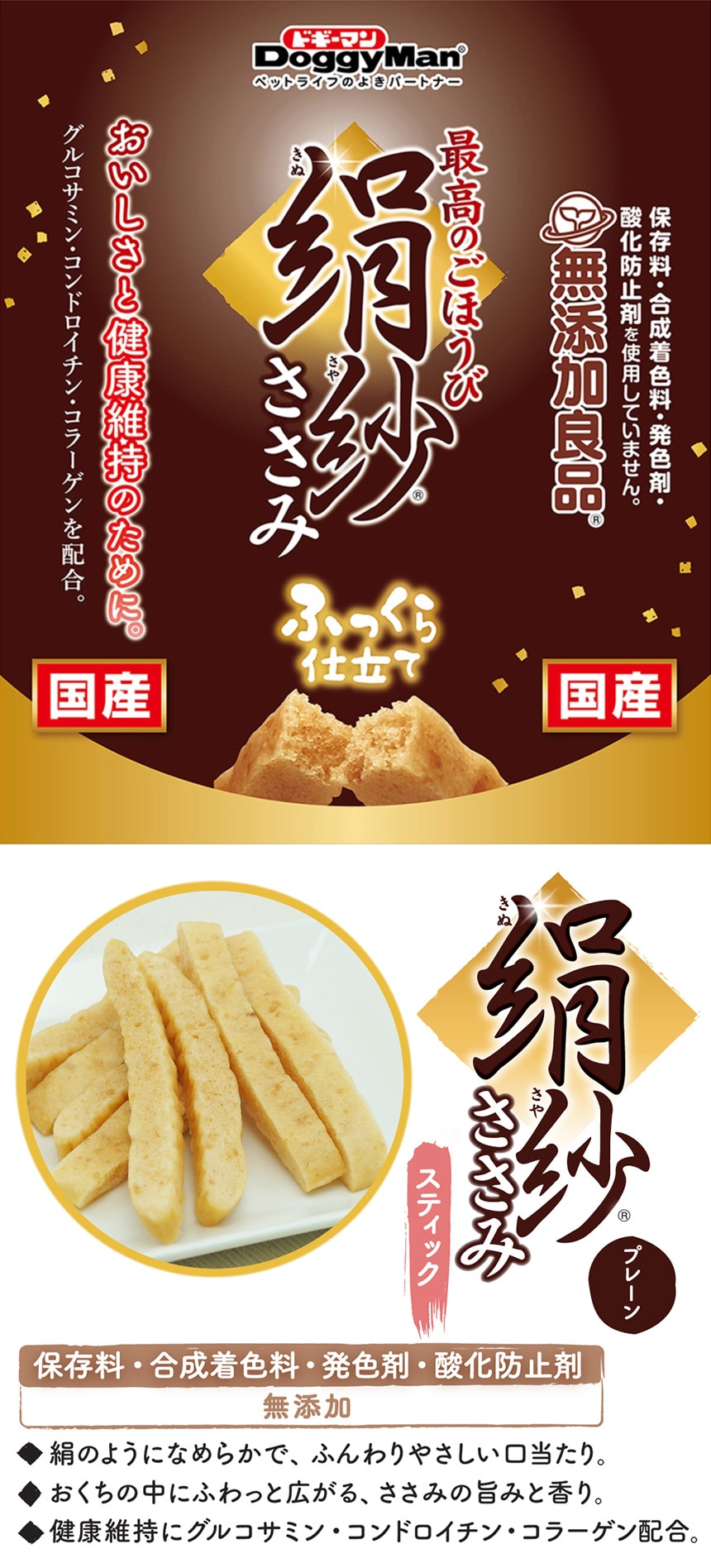 フレッシュな味わいや香りが長持ちする、便利な100g×3袋の分包タイプ。ササミたっぷり、至福の味わい。ふんわりやわらか新食感のごほうびおやつ。絹のような極上のおいしさをワンちゃんにお届けします。保存料、合成着色料、発色剤、酸化防止剤不使用。