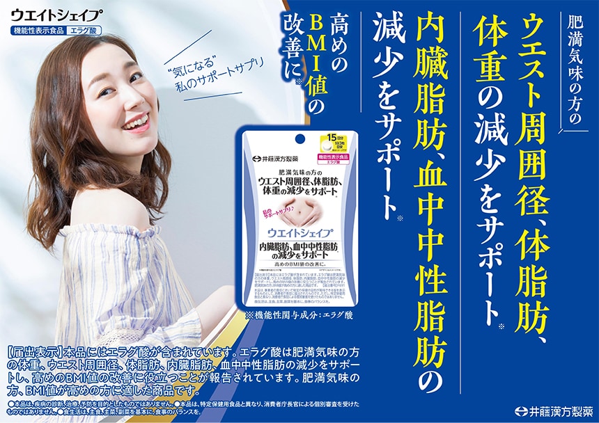 機能性関与成分エラグ酸が、気になる「体重、ウエスト周囲径、体脂肪、内臓脂肪、血中中性脂肪の減少」をサポートし、高めのBMI値の改善に役立ちます!