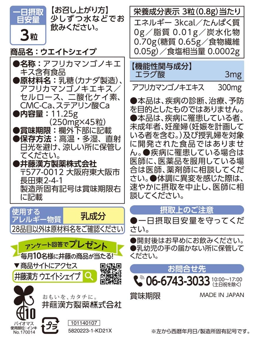 [6個]【機能性表示食品】井藤漢方製薬 ウエイトシェイプ 11.25g(250mg×45粒) | エラグ酸配合。「私の気になる」に着目した、肥満気味の方の機能性表示食品