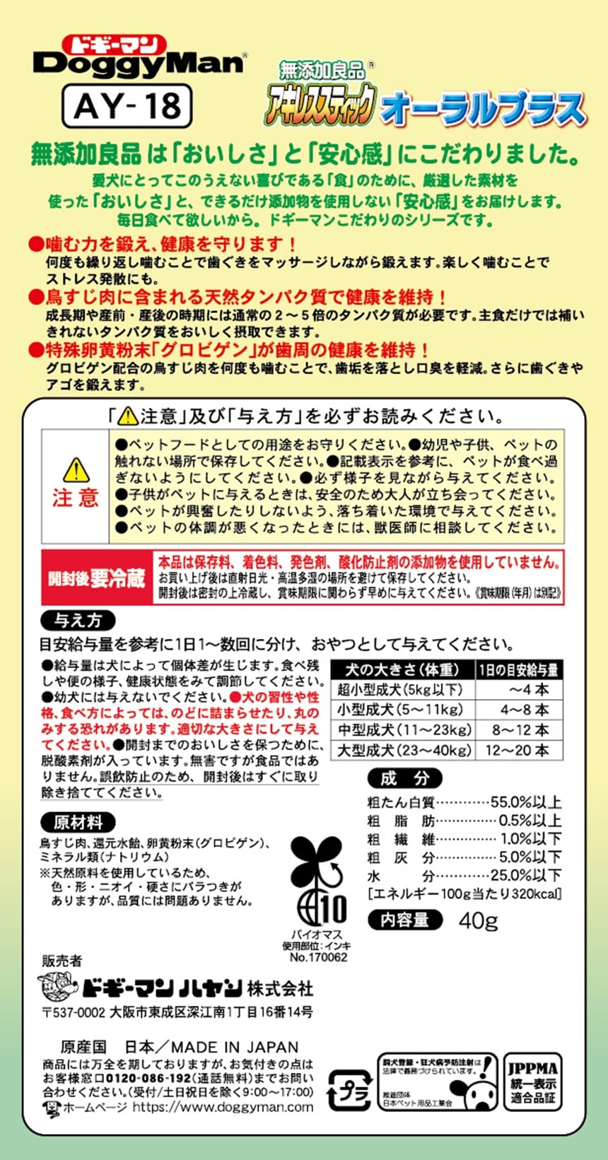 ・グロビゲン配合の鳥すじ肉を何度も噛むことで、歯垢を落とし口臭を軽減。さらに歯ぐきやアゴを鍛えます。