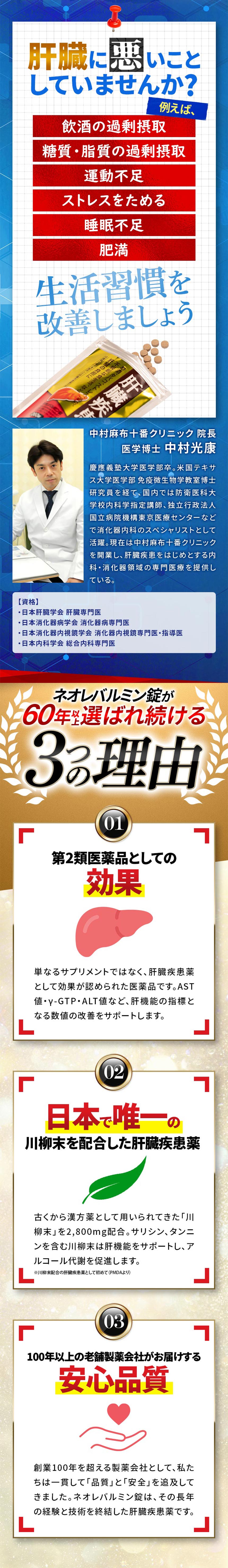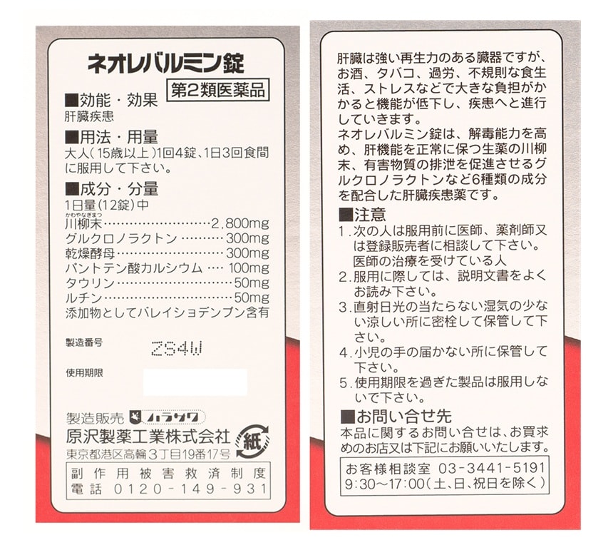 ネオレバルミン錠は、解毒作用を高め、肝機能を正常に保つ生薬の川柳末、有害物質の排泄を促進させるグルクロノラクトンなど6種類の成分を配合した肝臓疾患薬です。