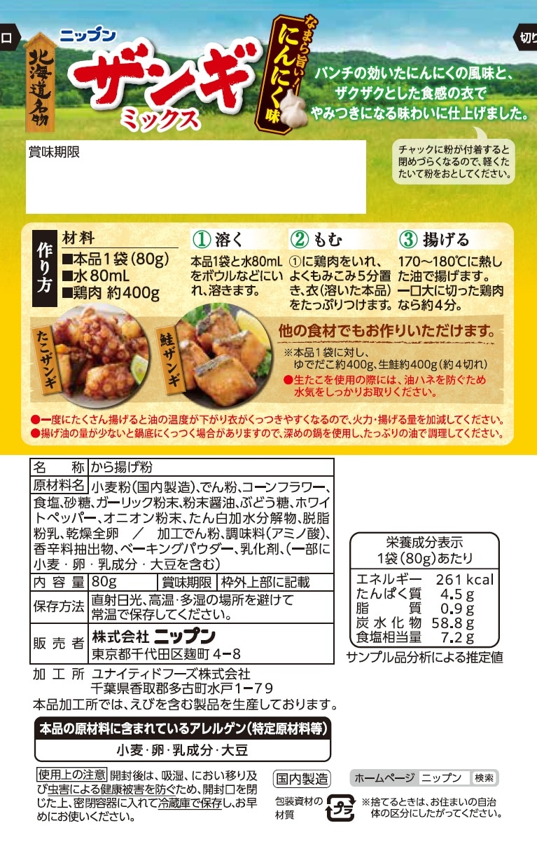 [40袋]ニップン ザンギミックス にんにく味 80g | パンチの効いたにんにくの風味と、ザクザクとした食感の衣で、やみつきになる味わいに仕上げました。