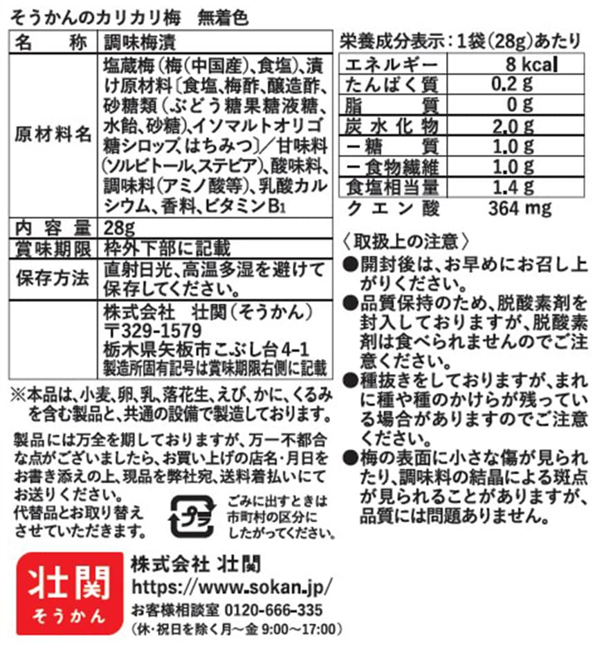 食べやすく種を抜き半分に割ったカリカリ梅です。梅の酸味にはちみつやシロップの甘味が効いた、バランスの良い甘酸っぱさが特徴です。持ち歩きに便利なチャック付きの袋です。