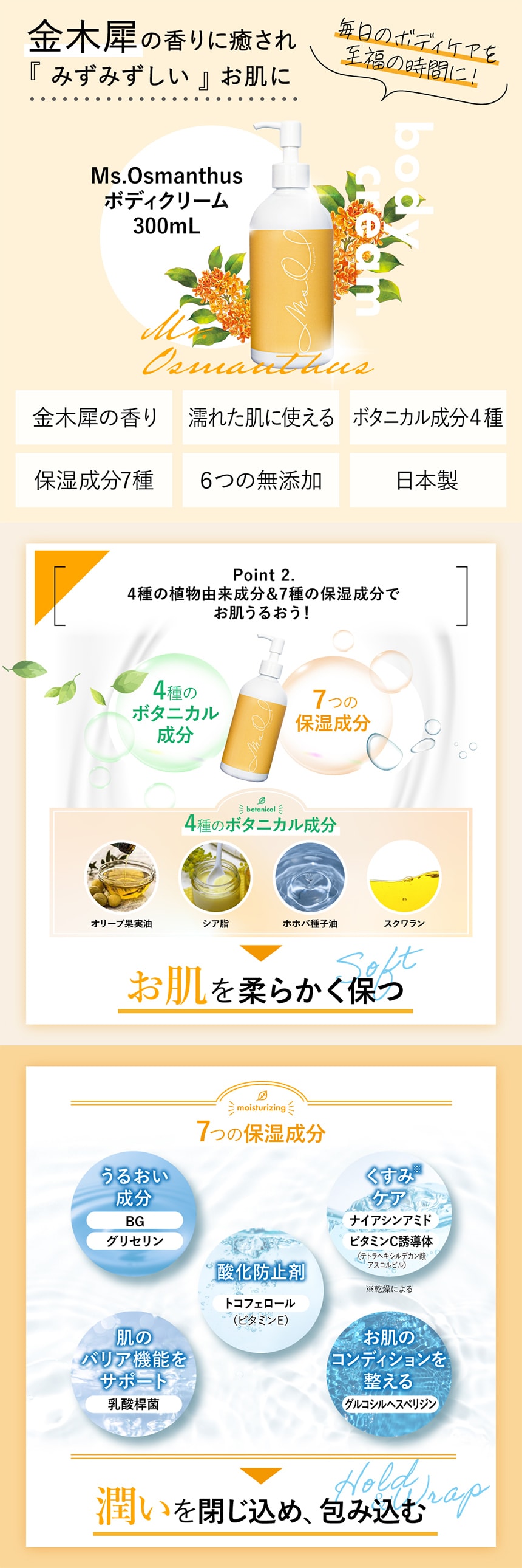 金木犀の香りに癒され、潤いのベールでお肌を保湿し、みずみずしいお肌に導きます。インテリアにもプレゼントにもシンプルで可愛いパッケージも人気です。