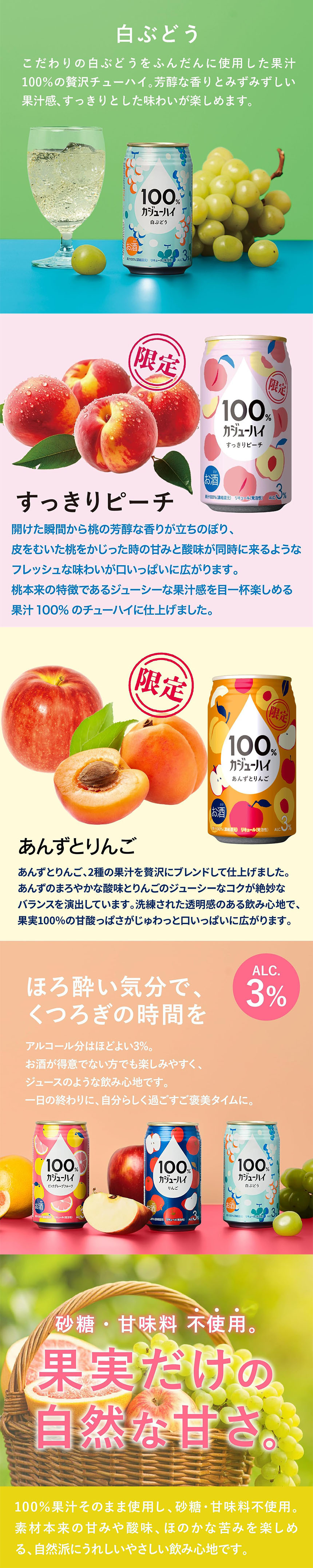いいことがあった日も、辛いことがあった日も、すべての一日は、特別だと私たちは考えています。「100% カジューハイ」は、日々の暮らしに大切なゆったりした自分時間、大切な人と過ごす心地のよい時間を彩るささやかなご褒美として、心からの満足と幸せをお届けできればと願っています。