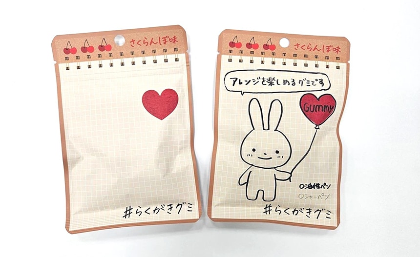 赤いハート型でさくらんぼ味のかわいいグミです。パッケージに自由にらくがきをしたり、アレンジして楽しめる商品です。