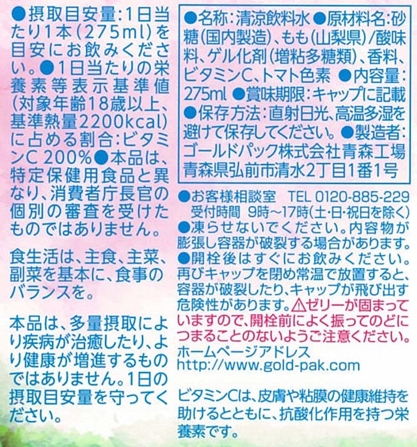子どもの好む果物を厳選。有数の桃生産地、山梨県産の桃をまるごと搾った桃果汁を使用した飲むゼリー飲料です。