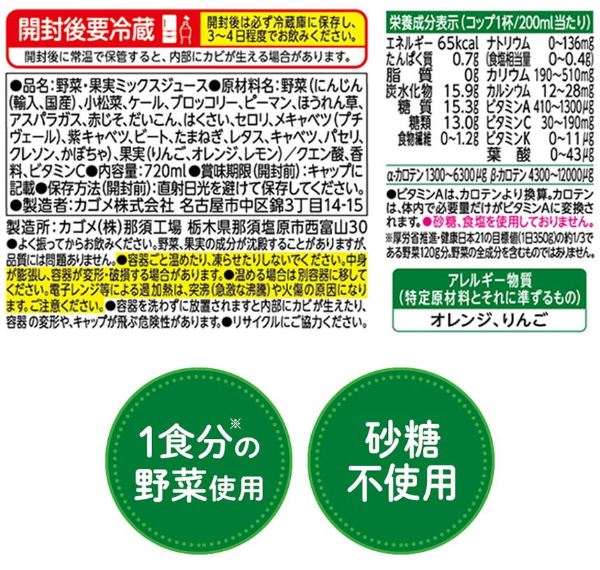 1食分の野菜(200ml当たり)を使用し、オレンジやリンゴのフルーティーな味わいを楽しみながらビタミンAとビタミンCがたっぷり摂れるので、家族みんながおいしく手軽に野菜を補える野菜飲料です。