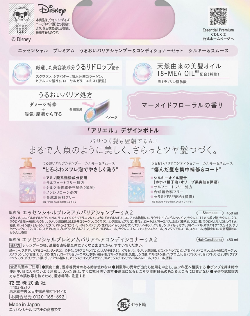 [3セット]花王 エッセンシャル プレミアム バリアシルキー&スムースポンプセット アリエルデザイン・マーメイドフローラルの香り | アリエルデザインバリアシャンプー・コンディショナー
