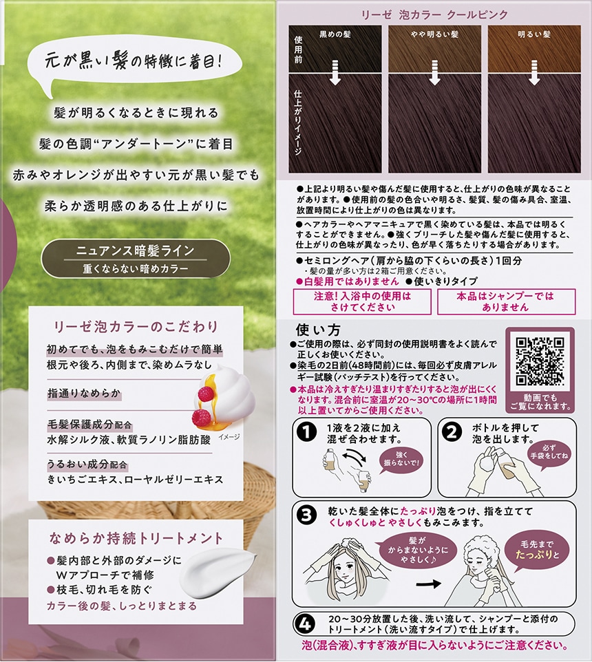 髪が明るくなる時に現れる、髪の色調"アンダートーン"に着目。赤みやオレンジが出やすい元が黒い髪でも、柔らか透明感のある仕上がりに。(医薬部外品)
