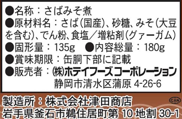 栄養成分表示:1缶(180g)当たり エネルギー 321kcal、たんぱく質 29.3g、脂質 16.4g、炭水化物 14.0g、食塩相当量 2.3g