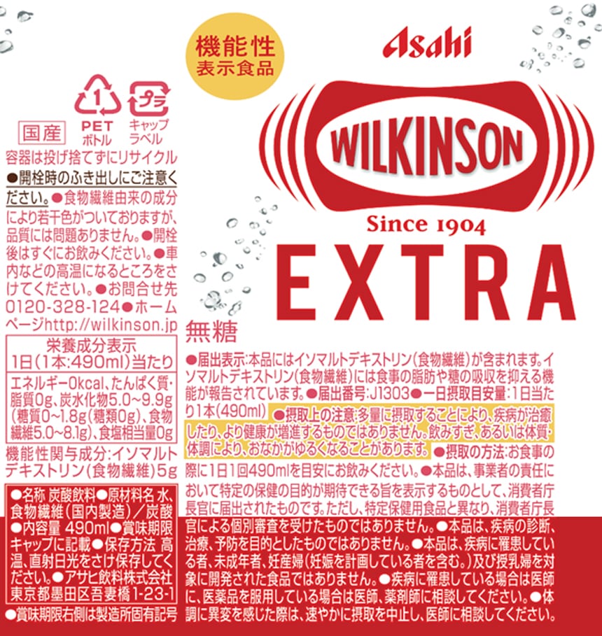 [48本]【機能性表示食品】アサヒ飲料 ウィルキンソン タンサン エクストラ PET 490ml | 脂肪や糖の吸収を抑える成分を含む食事と一緒に摂る「刺激、強め。」の炭酸水