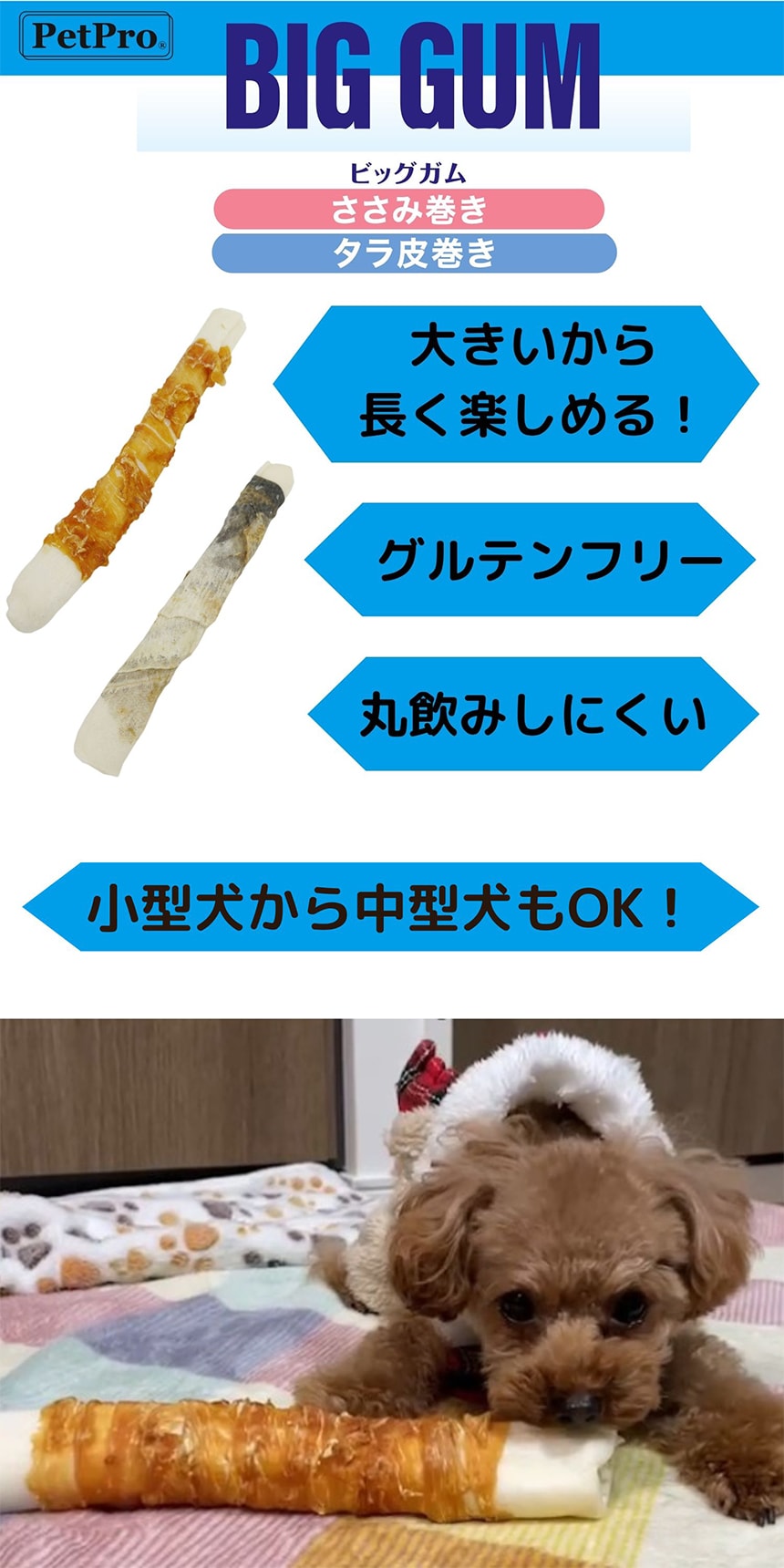 噛み応え抜群!長持ち!の大型犬用のビッグなガムです。嗜好性抜群のササミを巻き更においしさアップ。噛むことで、ストレス発散・歯の健康維持になります。