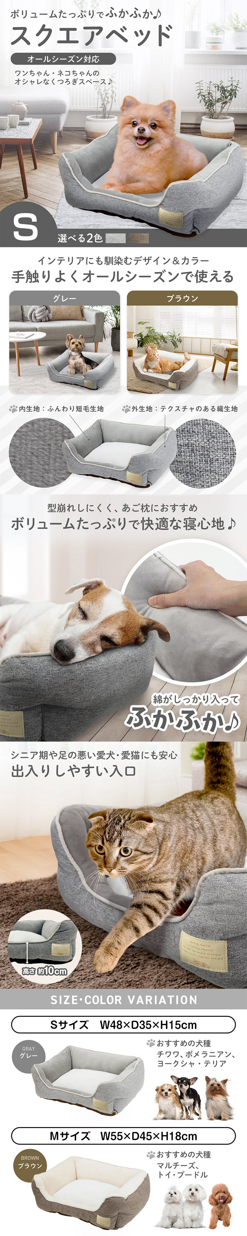 1年を通して使いやすい生地のスクエアベッドです。インテリアに馴染みやすいデザインと色合いになっています。内生地は手触りがよくオールシーズンで使えるふんわり短毛生地で、外生地は織生地です。