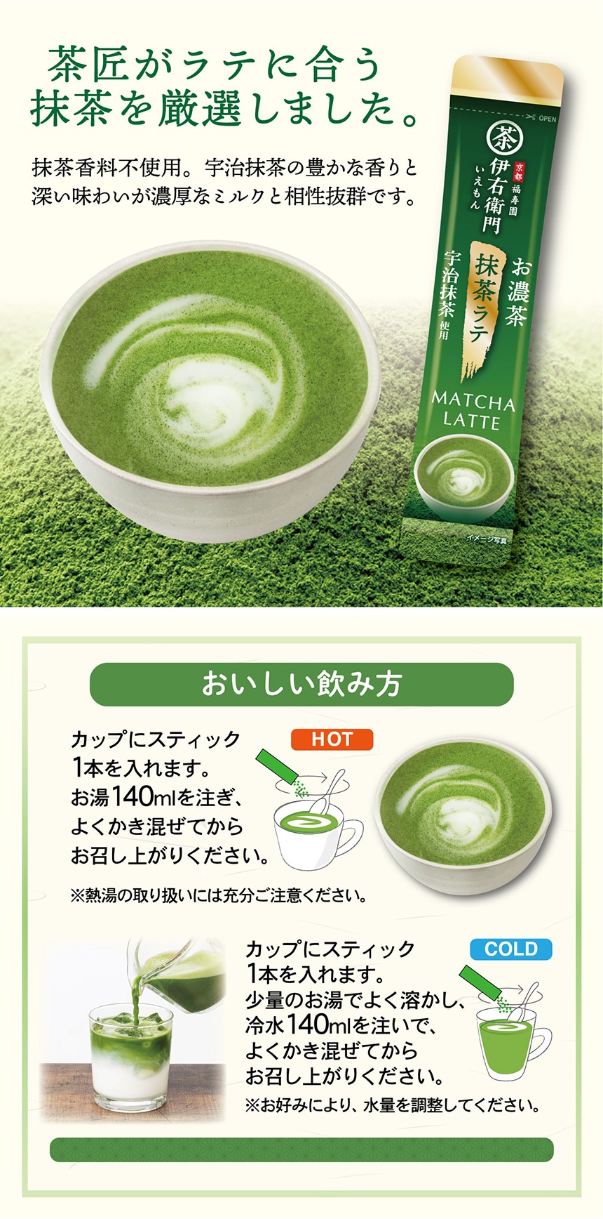 ラテに最適な抹茶を茶匠が厳選し、濃厚なミルクと調和させた抹茶ラテスティックです。