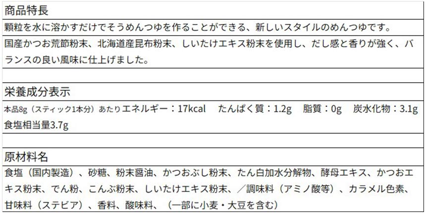 国産かつお荒節粉末、北海道産昆布粉末、しいたけエキス粉末を使用し、だし感と香りが強く、バランスの良い風味に仕上げました。