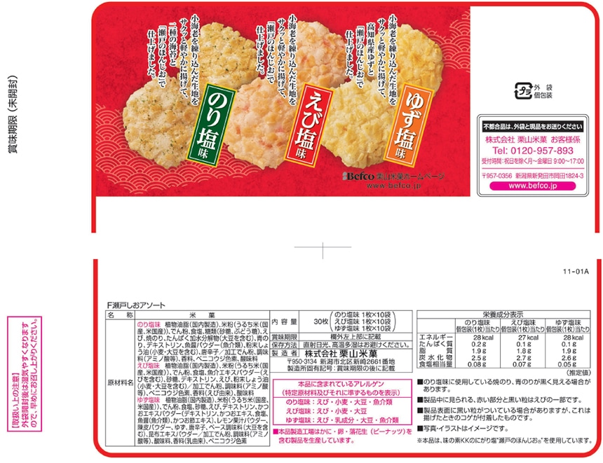 ●1袋で「えび塩味」「ゆず塩味」「のり塩味」の3種類がお楽しみいただけます。