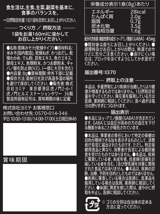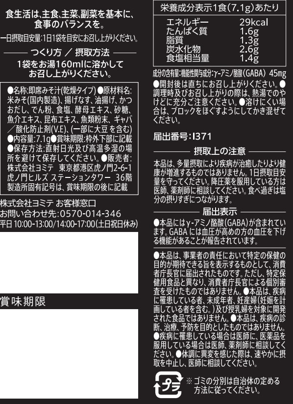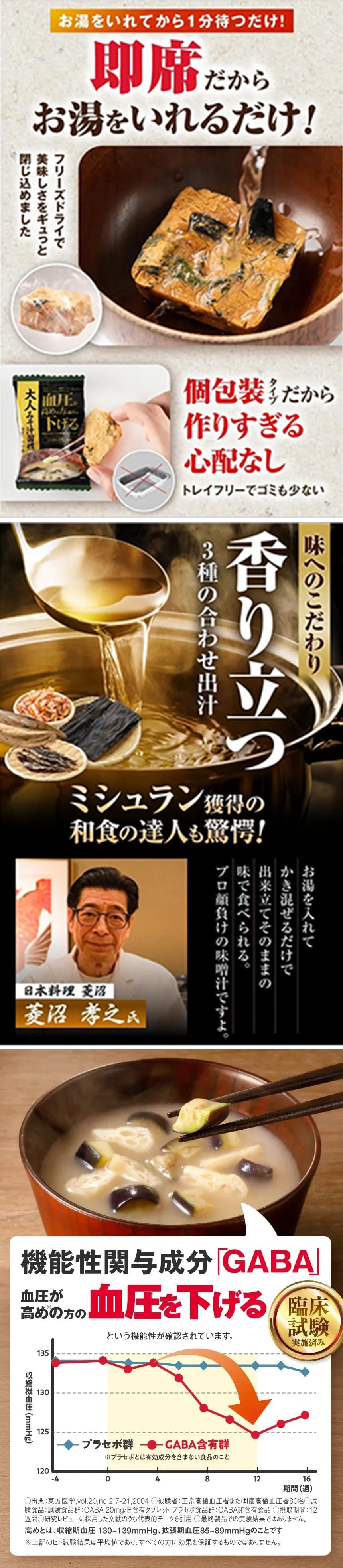 血圧が高めな方の血圧を下げる機能が報告されている機能性関与成分GABAが入っているフリーズドライのお味噌汁です。