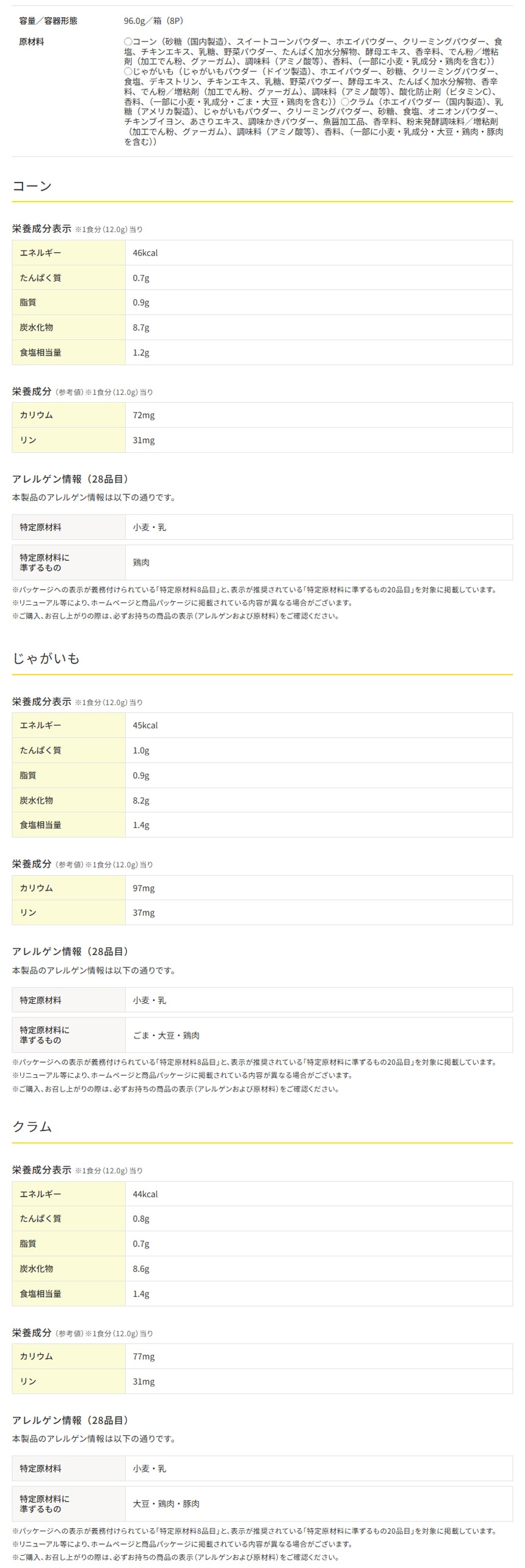まろやかクリーミーなコーン4食、じゃがいも2食、クラム2食の8食入り。