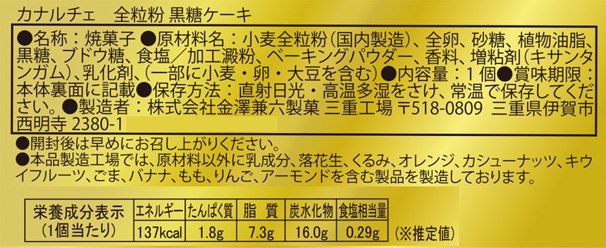 全粒粉100%にこだわり、独自のレシピでくせのないふんわり食感に仕上げた優しい甘さの黒糖ケーキです。