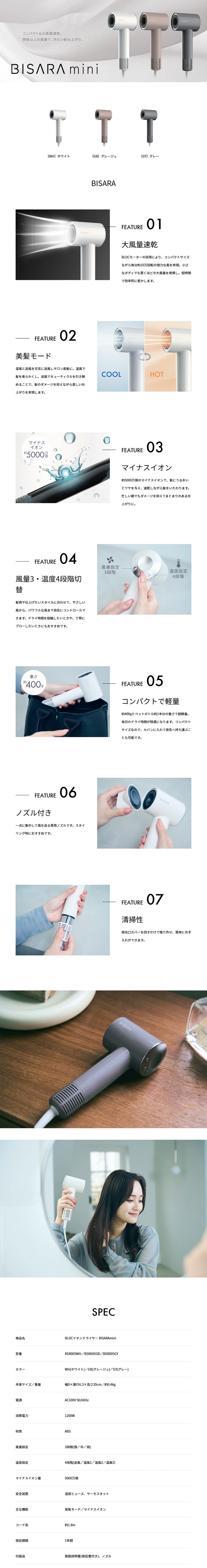 【グレー】クワッズ/BLDCイオンドライヤー「ビサラ ミニ」(専用ノズル付き)|美髪モード。温風と送風を交互に送風しサロン美髪に。コンパクト&大風量速乾。想像以上の風量でサロン級の仕上がりを。