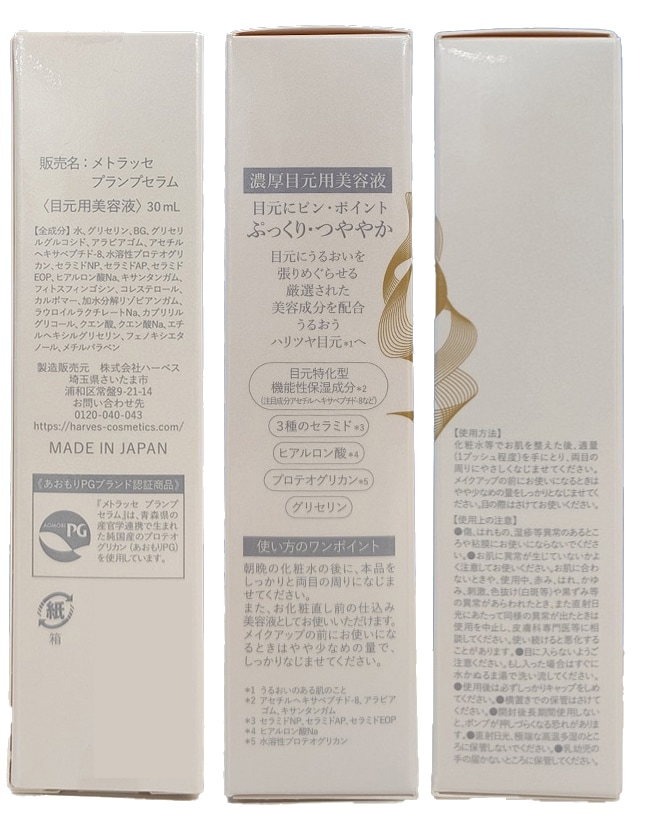 ボトックス*など美容に関心の高い人々に注目の成分「アセチルヘキサペプチド-8」等の目元特化型機能性保湿成分*1が乾燥サインに働きかけ、目元にパンとしたハリ感を与えます。 さらに、高保水成分「プロテオグリカン*2」をはじめ、「セラミド*3」や「ヒアルロン酸*4」等の目元にうるおいを張りめぐらせる厳選された美容成分を配合し、うるおうハリつや目元*5を叶えます。