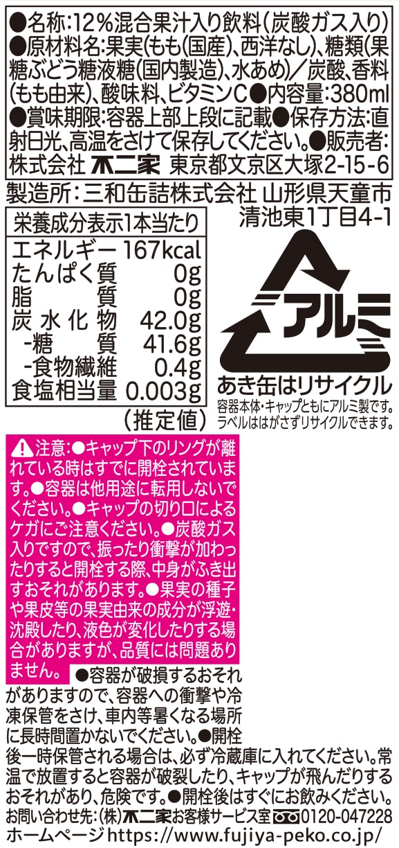 - 不二家 ネクタースパークリング 白桃&ラ・フランス ボトル缶 380ml