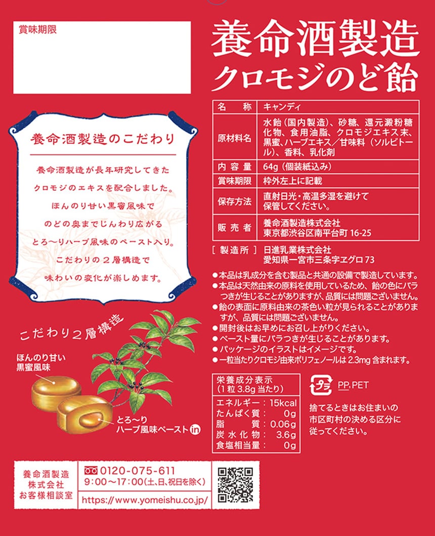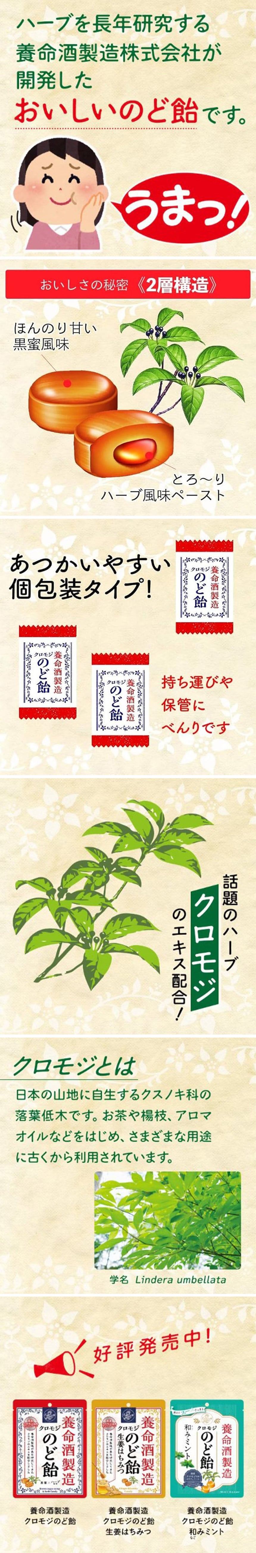 【商品の特徴】養命酒製造が長年研究してきたクロモジのエキスを配合したのど飴です。クロモジのエキスにはポリフェノールが含まれておりポリフェノールは植物自身が受ける様々な外的要因からの影響を和らげる成分のひとつとして知られています。ほんのり甘い黒蜜風味でのどの奥までじんわり広がるとろ~りハーブ風味のペースト入り。こだわりの2層構造による味わいの変化が楽しめます。のどの乾燥を感じた時におすすめの商品です。