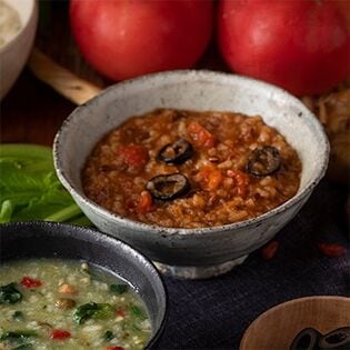 【商品の特徴】トマト味をベースに3種類のハーブが効いた南欧風のお粥です。トマトや赤米とブラックオリーブの色合いが楽しめます。[1食当たり78kcal]