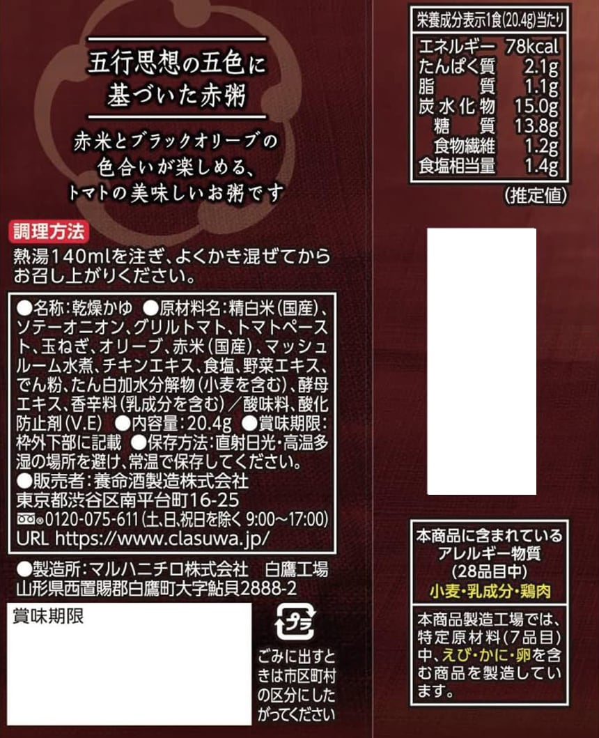 【シリーズ全体の特徴】養命酒製造オリジナルレシピの健康粥です。フリーズドライで約1分のカンタン調理。お手軽ながらもつぶつぶ素材とゴロゴロ野菜の食べごたえ。時短でもおいしく食事したい方や趣味に時間を費やすアクティブシニアにおすすめ。小腹が空いたときの夜食や飲みの〆にも最適。一食当たり70~80kcal(フレーバーにより異なります)なのでカロリーコントロールにもお役立ていただけます。