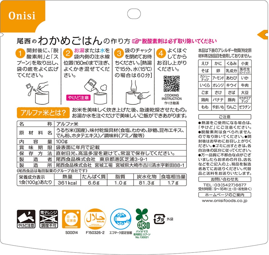 尾西食品 アルファ米 わかめごはん 1食分 非常食 長期保存 100g×75個 | 「尾西のアルファ米わかめごはん1食分」はわかめの旨みと、やわらかな風味が魅力です。