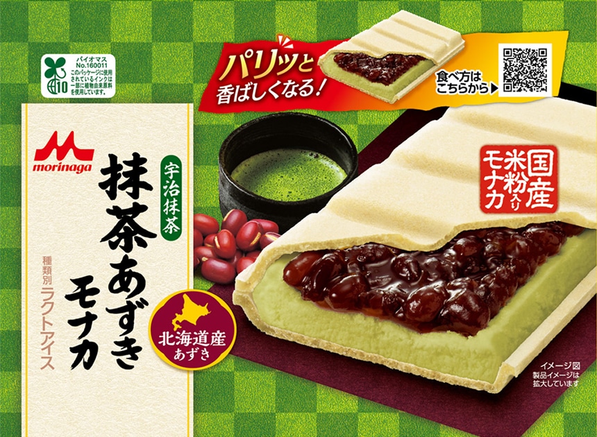 宇治抹茶アイスの上に粒残りの良い粒餡を乗せたモナカアイス。