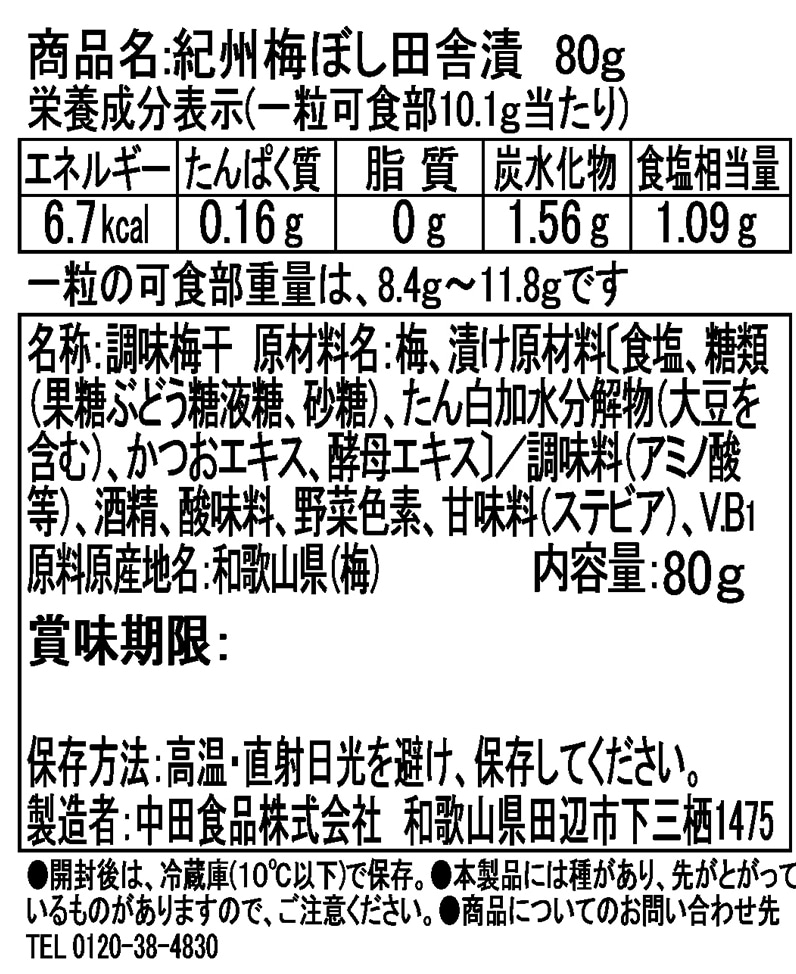 - 中田食品 紀州梅ぼし田舎漬 80g×6個