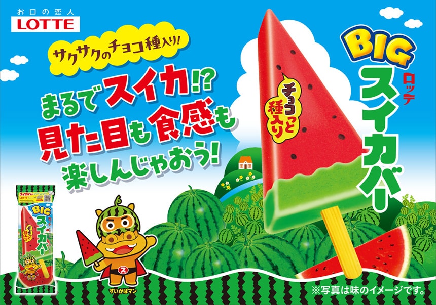 サクサクとしたチョコ種が入ったまるでスイカのような形をした見た目も食感も楽しいアイスバーです。赤色部分は果肉を緑色部分はシャキシャキとした皮をイメージしています。