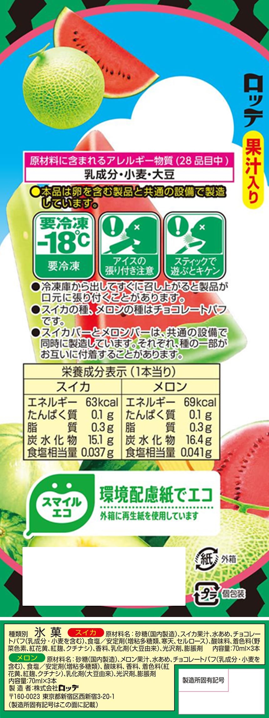[冷凍]ロッテ スイカ&メロンバー 420ml(6本入)×9箱 | チョコ種入りでまるでスイカとメロンのような形と食感が楽しい家族向けマルチアイスバーです。