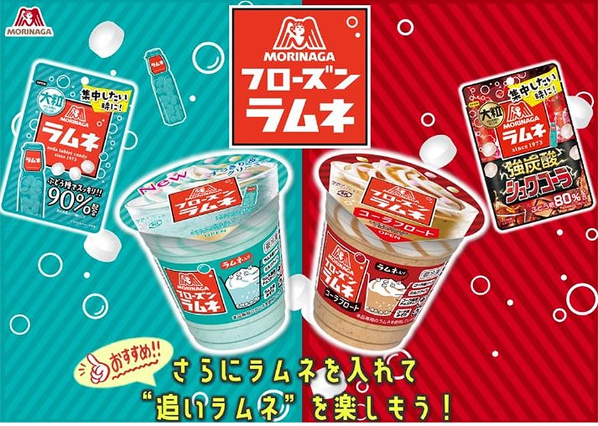 食感味わい変化が楽しめる。春夏にぴったりなラムネ味のパフェアイス。ラムネ味ソース入りのミルクアイスラムネ味のみぞれに2種類のラムネをトッピング。