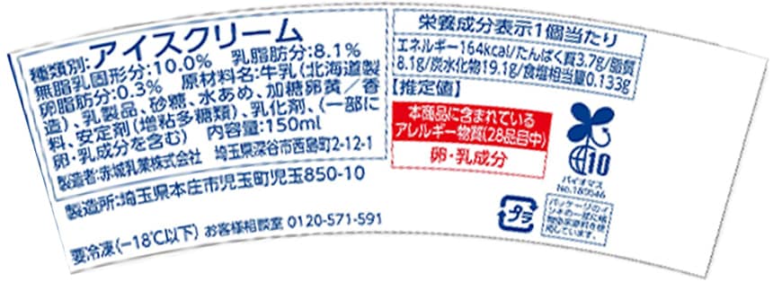 ※アイスクリーム類は、-18度以下での冷凍保存の状態では、品質の劣化が極めて小さい食品ということで、賞味期限の設定がされておりません。