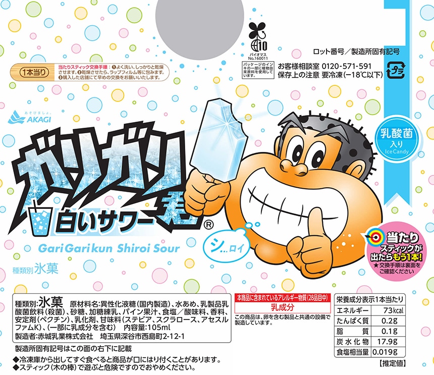 白いサワー味のアイスの中に、ガリガリッとした食感が特徴の白いサワー味のかき氷を入れたアイスキャンディーです。