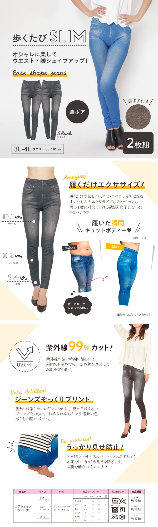 2枚組 裏ボアタイプ【3L-4L/ブラック2枚】コアシェイプデニムプリントレギンス | 楽して美脚&お腹シェイプアップ!さらに裏ボアでポカポカ♪
