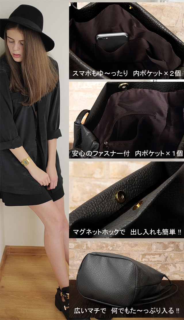黒なのでどんな色の洋服にもあわせられるのが魅力的。また、カバンじたいも、軽く、使いやすいです。手触りも、柔らかい感じなので、助かります。