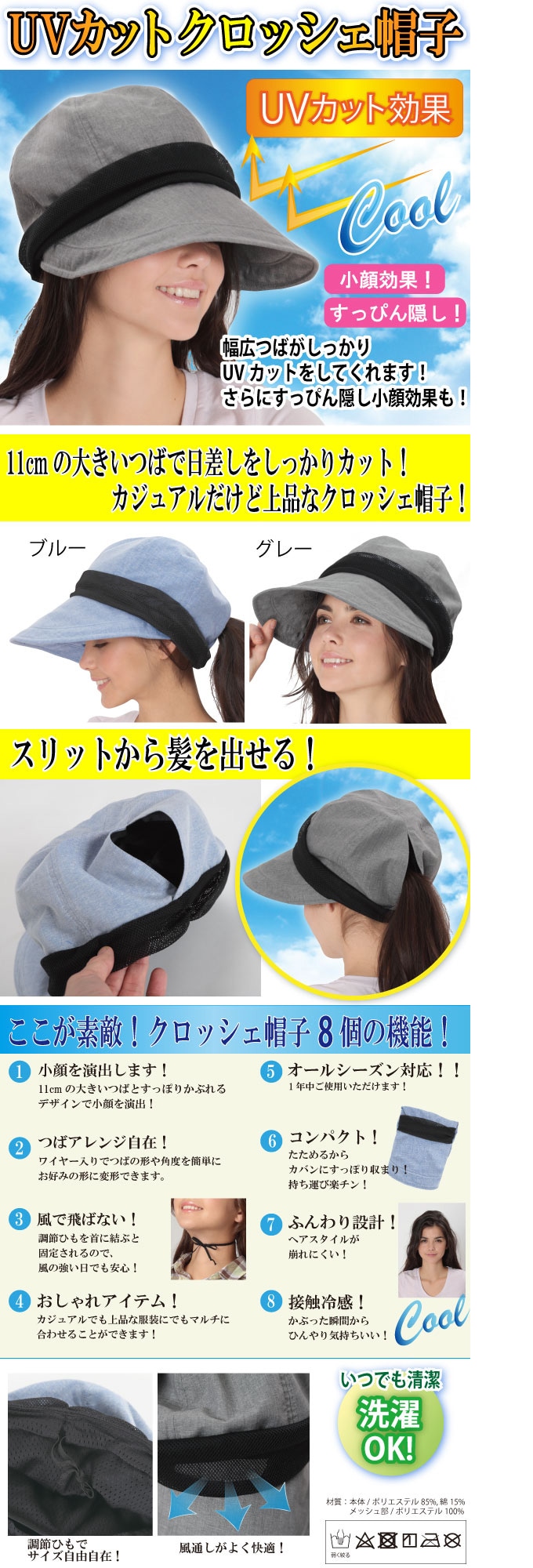 つばが大きいので、日差しも遮るし、すっぴん隠しもばっちりです。オールシーズン対応とありますが、生地は薄めですし、薄いブルーで夏向きです。洗濯しても乾きは早そうです。後ろのスリットから結んだ髪が出せるのも気に入りました。買ってよかったです。