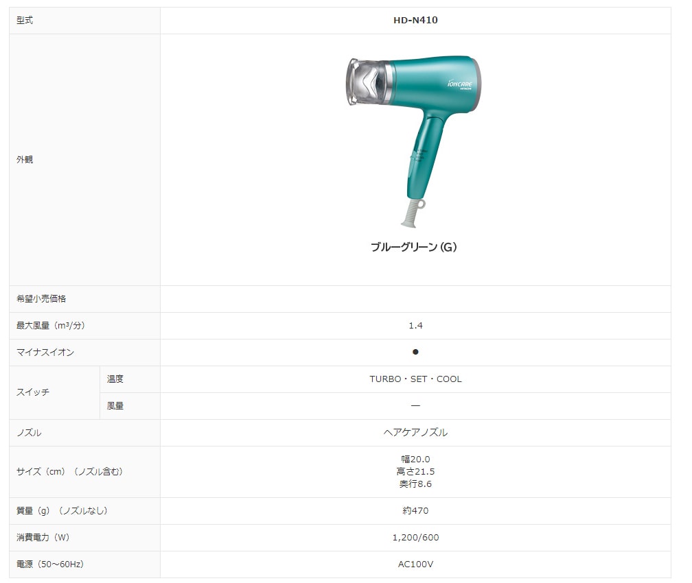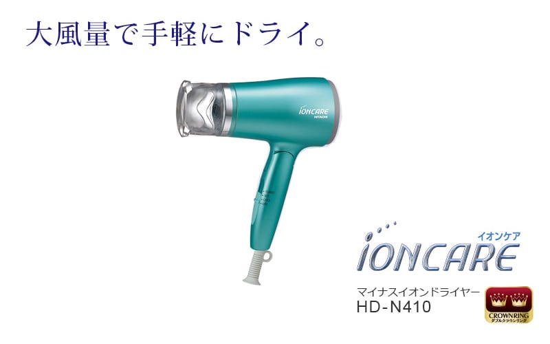 - 日立(HITACHI)/マイナスイオンドライヤー イオンケア(ブルーグリーン)/HD-N410(G)