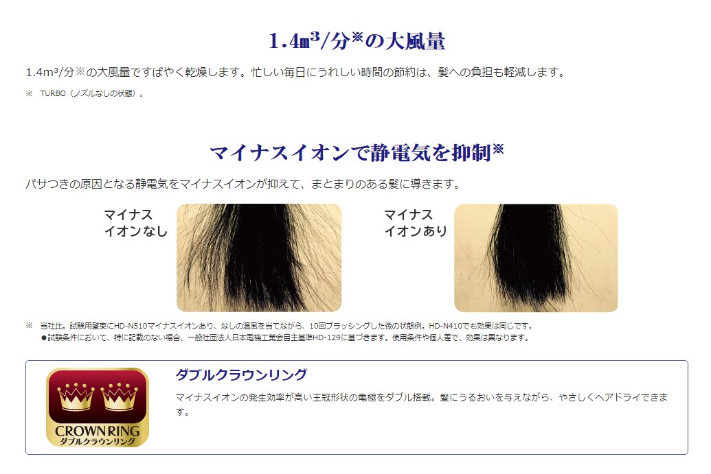 マイナスイオンの発生効率が高い王冠形状の電極をダブル搭載。髪にうるおいを与えながら、やさしくヘアドライできます。