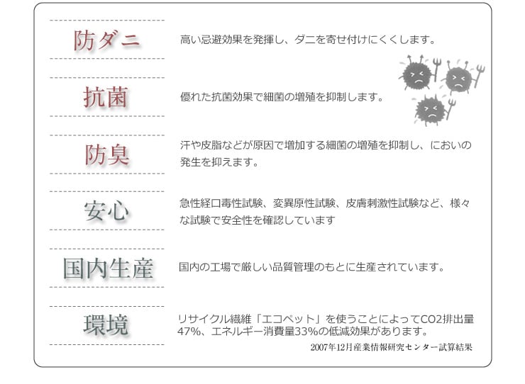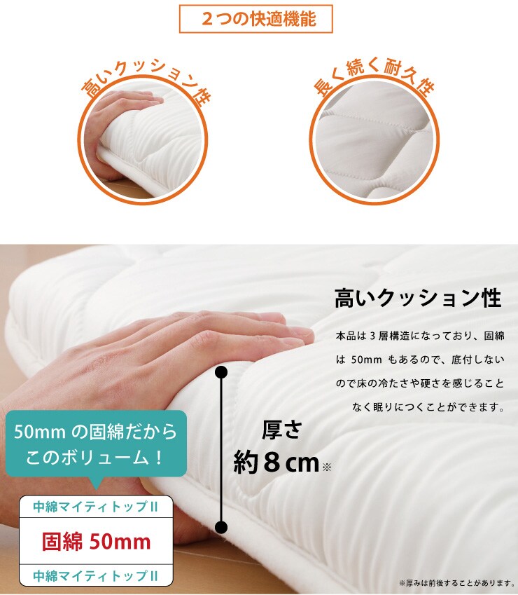 ・原材料/材質/素材:中材:巻綿/ポリエステル100%:1.5(帝人マイティトップ入)、固綿/ポリエステル100%:2.0(厚50mm)
