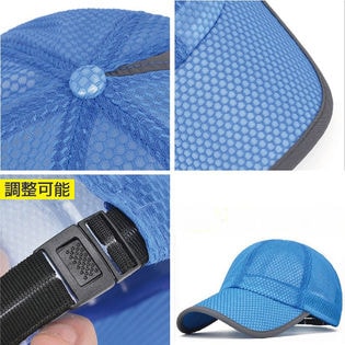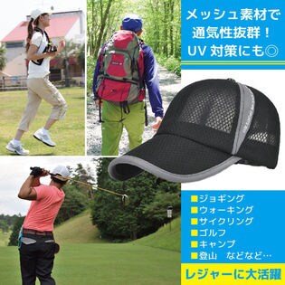ランニングやアウトドアに涼しく軽いスポーツキャップ。メッシュ素材で通気性抜群!UV対策にも。アジャスター調節ができるので、頭にピッタリフィットします。レジャーに大活躍な帽子です。