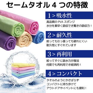 何度でも再利用できて経済的なセームタオルです。吸水性抜群で、様々なシーンで便利にご利用いただけます。タオルのようにかさばらず、コンパクトに持ち歩け、アウトドアやイベントにも便利です。