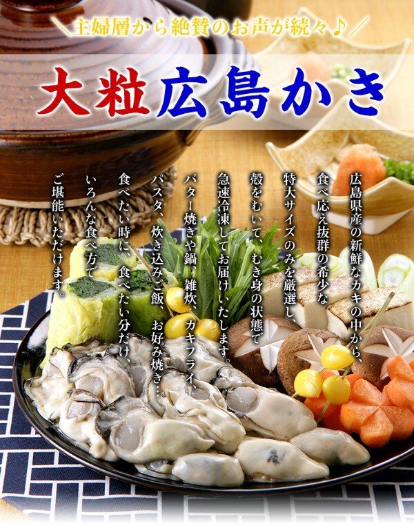 「カキは大好きなんですが、殻から身を取り出すのが苦手で…」そんなお客様のために!殻むき不要の、とっびっきり美味しいカキをご紹介します!日本一の生産量を誇る広島県産だから安心・安全!食べ応え抜群の希少な特大サイズを厳選し、むき身の状態でお届け!面倒な殻割り不要!また、1粒ずつ個別に急速冷凍してあるので、食べたい分だけ調理可能!主婦層から絶大な人気を誇る当店の定番アイテムです。バター焼き、お鍋、雑炊、カキフライ… いろんなお料理で栄養満点カキのフルコースをご堪能ください♪